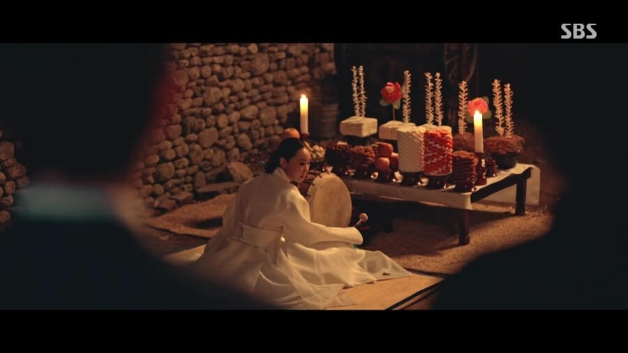 지난 2화에서는 무당 최만월이 고기를 앞에 두고 '이리온~' 하며 애태우다가 죽이는 장면이 나왔는데요. 7화에서는 염승옥 부부와 함께 고사 지내던 최만월이 창고에 들어가서 바로 죽이는 장면이 나옵니다. 별생각 없이 보면 그 장면이 이 장면인가 보다 할 수 있지만, 사실 세부적으로 살펴보면 두 의식은 서로 다른 의식입니다.