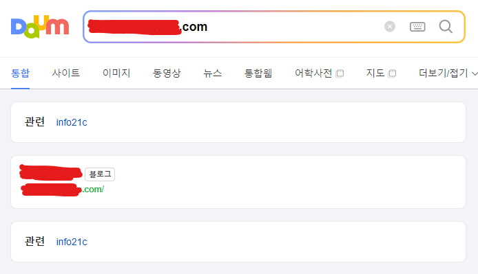 블로그의 품질에 대한 상태는 '저품질 → 준 최적화 → 최적화'의 단계가 있는데요. 앞서 저품질과 최적화 상태는 확인해 보았으니, 준 최적화에 대해 알아보겠습니다. 준 최적화는 저품질과 최적화 사이에 있는 단계로 블로그 주소를 다음 사이트에 검색해 보았을 때, 사이트탭에는 뜨지 않지만 통합웹에 글이 검색되는 경우입니다.