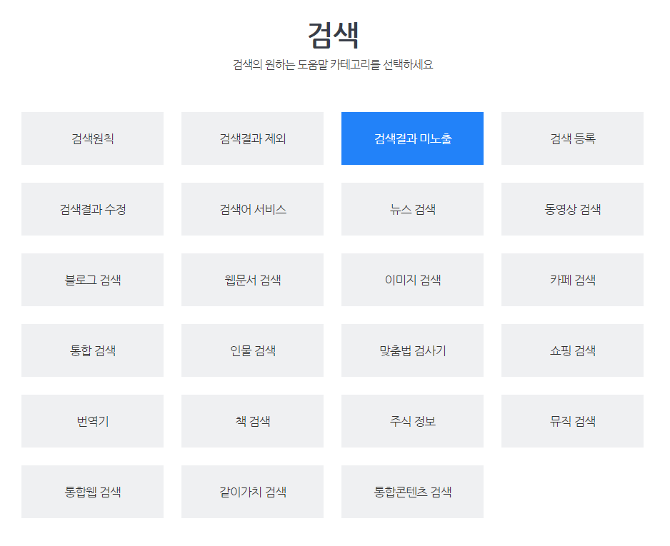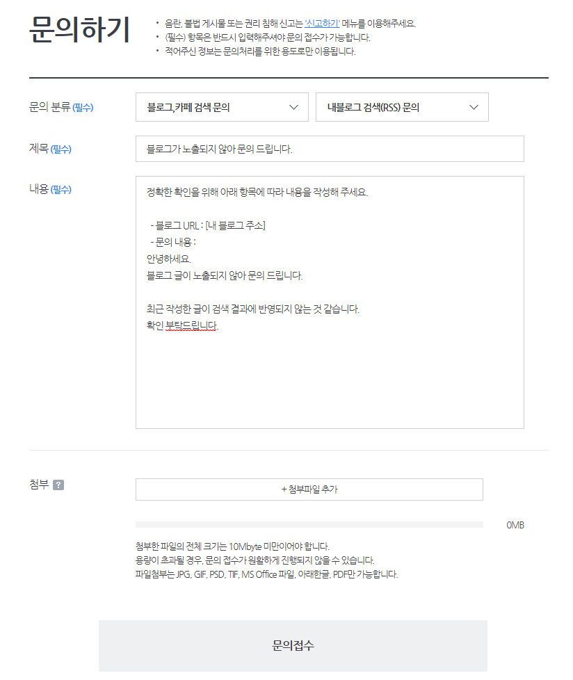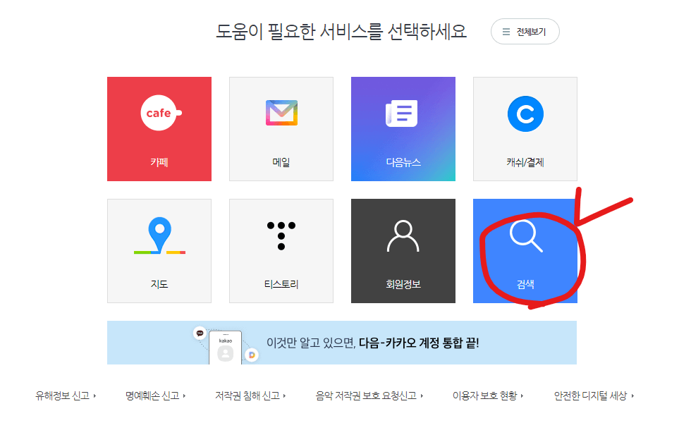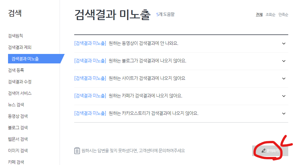 먼저 다음 고객 센터에 들어가서 '검색' 부분을 클릭한 후, '검색 결과 미노출'을 클릭하고 문의 내용을 남기는 방법이 있습니다. 노출되지 않는 부분을 첨부 파일로 캡처해서 올려주면 도움이 되겠죠?